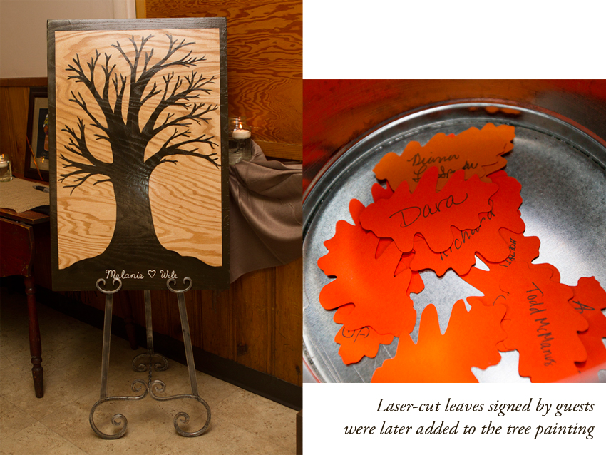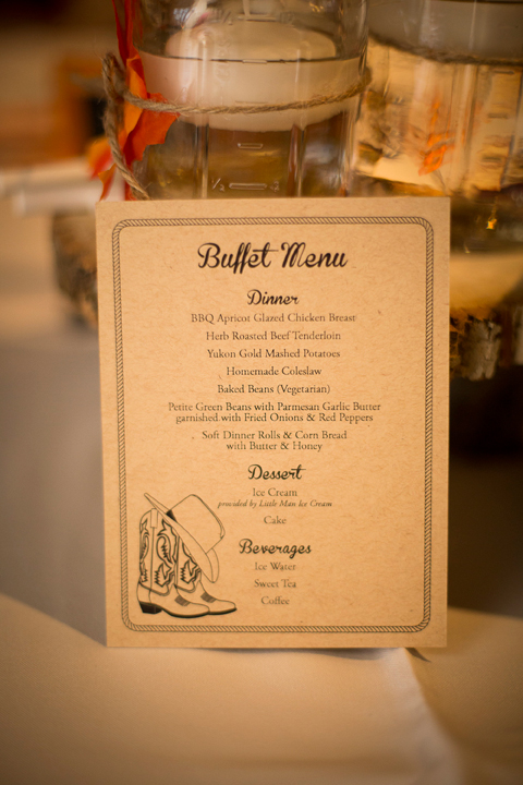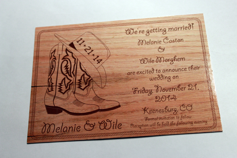 This stationery set was designed based on the couple's ideas and suggestions with a dash of our own imagination. They were to have a November wedding with Autumn colors and a western theme. The wedding and reception were held on separate days and had separate guest lists of different sizes. A more formal invitation was designed for the wedding guests and a more relaxed invitation was designed for the reception. Guests were encouraged to wear their cowboy hats and boots!